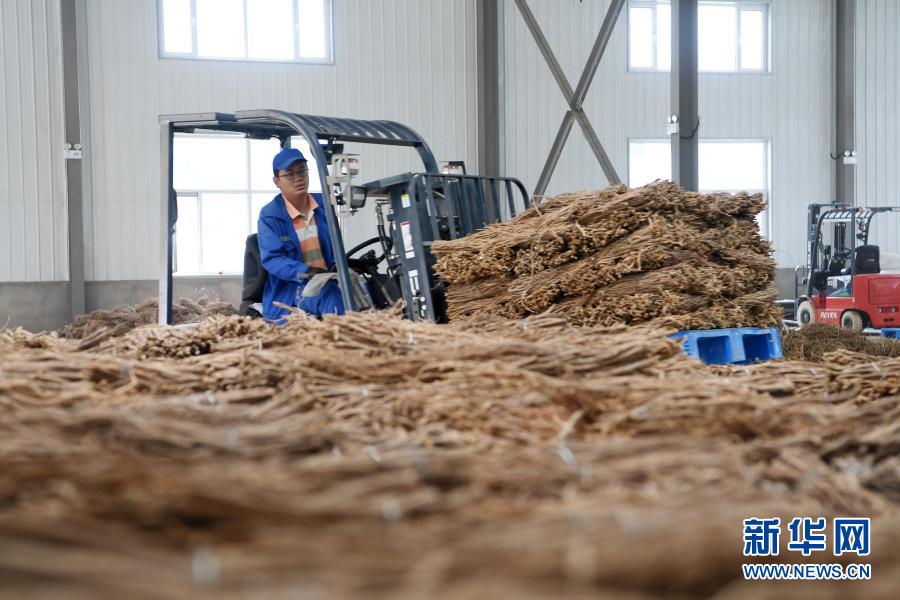 在宕昌縣哈達鋪琦昆現代中藥材倉儲物流基地,工作人員使用叉車搬運中藥材(9月18日攝)。新華社記者 范培珅 攝
