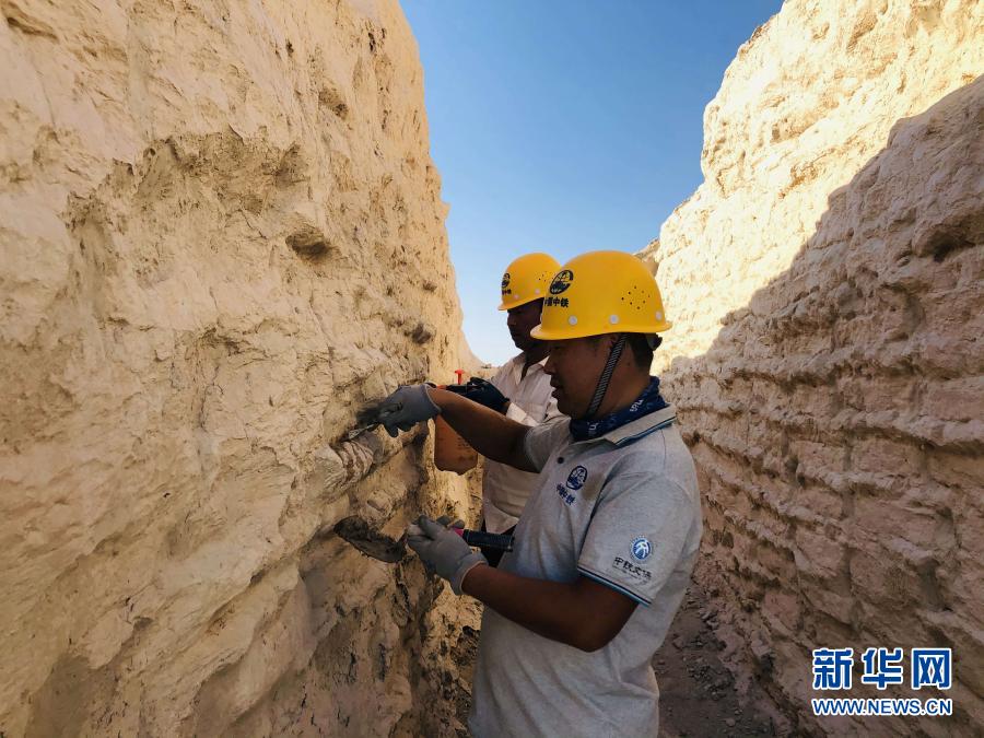 文物保護工作者在樓蘭古城內(nèi)搶險加固三間房遺址(9月12日攝)。新華社發(fā)