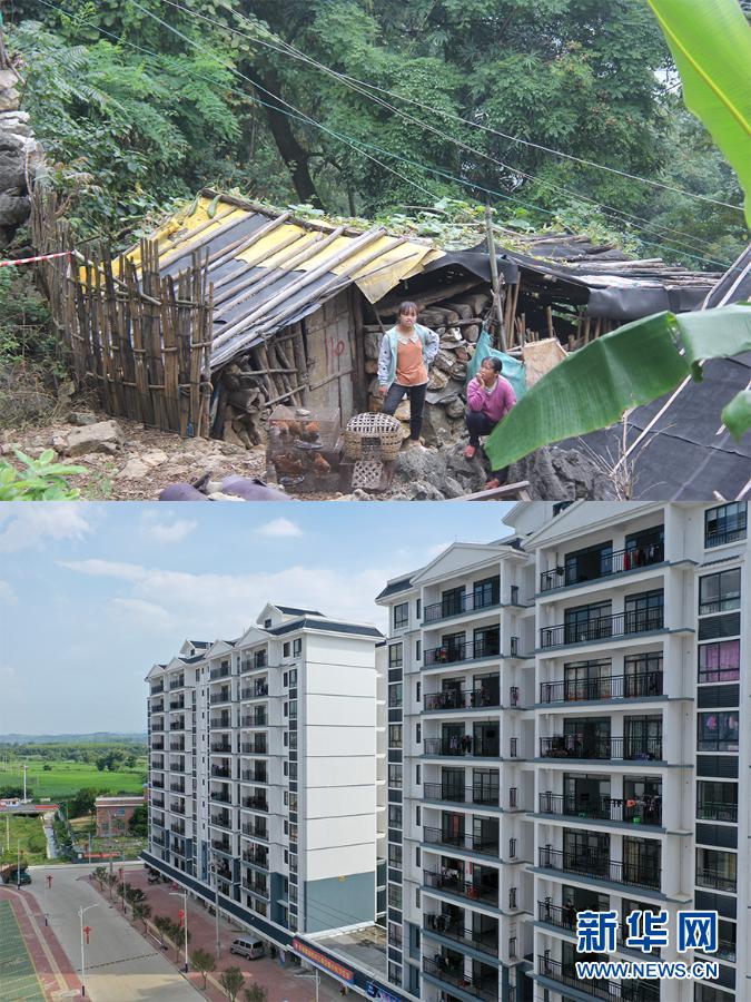 這是一張拼版照片,上圖為:2018年11月11日在廣西田東縣思林鎮龍邦村拍攝的村民和自家簡陋的房屋(思林鎮政府供圖);下圖為:2019年8月28日拍攝的當地為龍邦村新建的位于廣西田東縣思林鎮的易地扶貧搬遷安置點(無人機照片,新華社記者 曹祎銘 攝)。新華社發