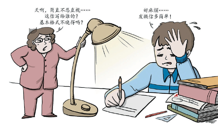 齊齊從小學一年級就開始練習毛筆字,如今已經能寫出很不錯的行書,但他也從不寫信,“有必要嗎?”齊齊說,父母要求他每個月要給遠在老家的祖父母、外祖父母打電話,每次電話的通話時間也就兩三分鐘,“我爸他們也就是問奶奶吃飯了沒,多買點吃的,不舒服趕緊去醫院……就這幾句話,真沒營養。”