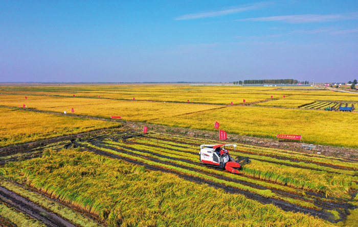 9月27日,農民操作機械在興安盟袁隆平院士工作站鹽堿地水稻基地收獲水稻 徐欽攝 / 本刊