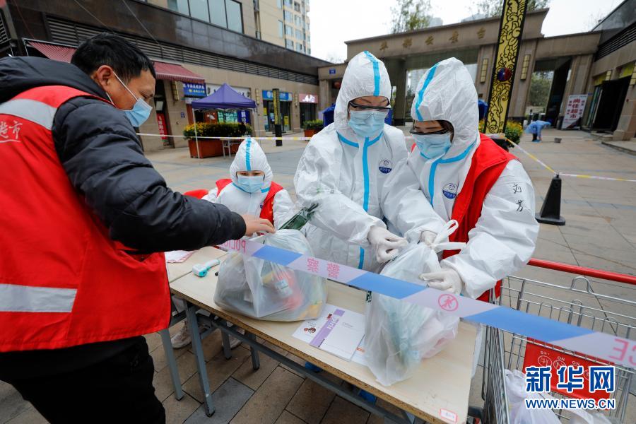 12月10日,在成都市成華區(qū)崔家店華都云景臺小區(qū)外,社區(qū)工作人員和志愿者在居民訂購的生活物資上標(biāo)記房號,由專人送至居民家。新華社記者 沈伯韓 攝