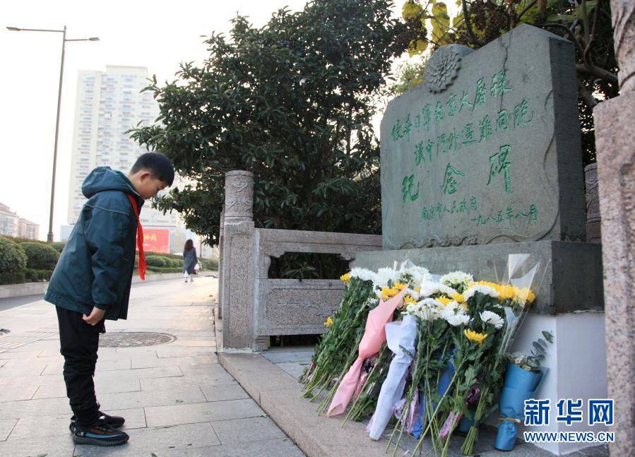 12月12日,一名小學(xué)生在侵華日軍南京大屠殺漢中門外遇難同胞紀念碑前鞠躬。新華社發(fā)(劉建華 攝)