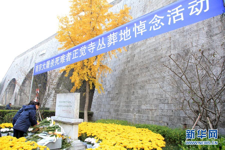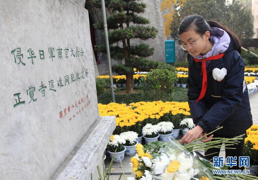 12月12日,在侵華日軍南京大屠殺死難同胞叢葬地(正覺寺),參加悼念活動的小學(xué)生向遇難同胞紀念碑獻花。新華社發(fā)(劉建華 攝)