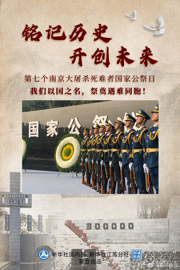 今天是第七個南京大屠殺死難者國家公祭日,讓我們銘記83年前的12月13日,沉痛緬懷30萬遇難同胞,警鐘長鳴,珍愛和平!(記者:蔣芳、李響、邱冰清 海報設計:張惠慧) ????