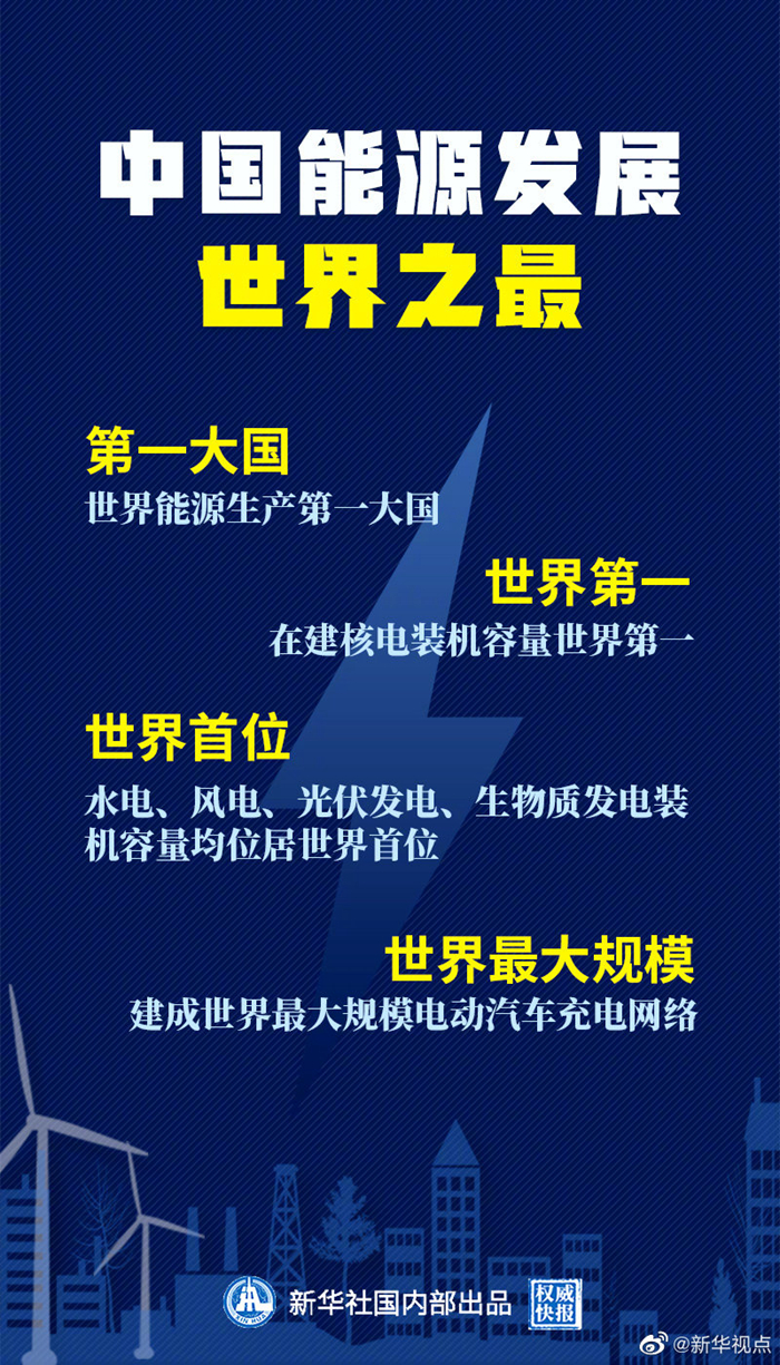 根據(jù)國務院新聞辦公室21日發(fā)布的《新時代的中國能源發(fā)展》白皮書,中國能源發(fā)展有多個世界之最:初步核算,2019年中國一次能源生產總量達39.7億噸標準煤,為世界能源生產第一大國;截至2019年底,在運在建核電裝機容量6593萬千瓦,居世界第二,在建核電裝機容量世界第一;截至2019年底,水電、風電、光伏發(fā)電、生物質發(fā)電裝機容量分別達3.56億千瓦、2.1億千瓦、2.04億千瓦、2369萬千瓦,均位居世界首位;截至2019年底,全國電動汽車充電基礎設施達120萬處,建成世界最大規(guī)模充電網絡。(記者:劉羊旸 海報設計:張晨光)