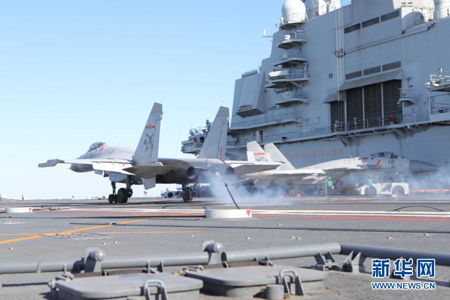 飛行學員駕駛殲-15艦載戰斗機在遼寧艦成功實施阻攔著艦(資料照片)。新華社發(楊皓 攝)