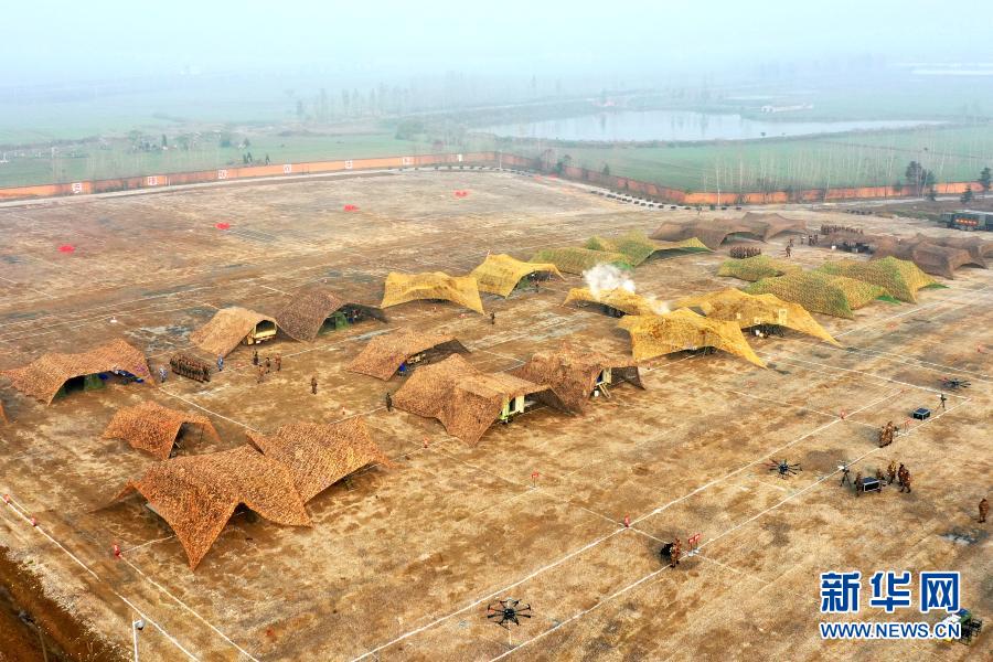 飲食保障隊參賽隊員在偽裝網下的炊事車內加工野戰快餐,并利用無人機前送(11月29日攝,無人機照片)。新華社發(姜梓涵 攝)