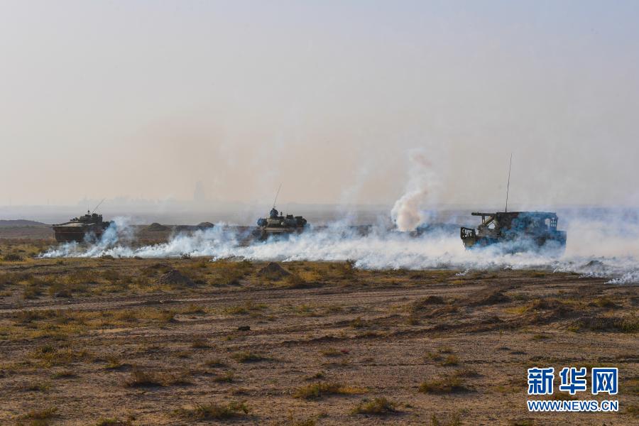 東部戰區陸軍第73集團軍某旅紅四連官兵在大漠戈壁參加紅藍對抗演練(10月9日攝)。新華社發(劉志勇 攝)