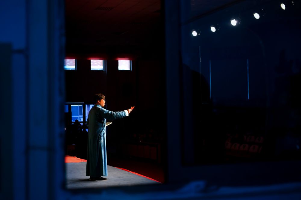 記者觀看了武凌云夫婦的一場演出。山西省古交市第一中學禮堂的舞臺上云霧繚繞,站在學生中間的高君宇與臺上的石評梅在“幻夢”中互道衷情,深情對望。