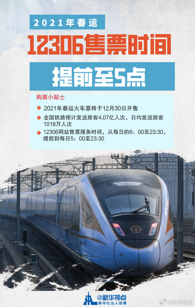 2021年鐵路春運自1月28日開始,3月8日結束,共40天,全國鐵路預計發送旅客4.07億人次,日均發送旅客1018萬人次。據悉,鐵路部門將鐵路12306網站售票服務時間從每日的6:00至23:30,提前到每日5:00至23:30;同步12306網站和線下窗口改簽規則,線上也可改簽乘車當日24點前其他列車車票。(記者樊曦、周圓)?