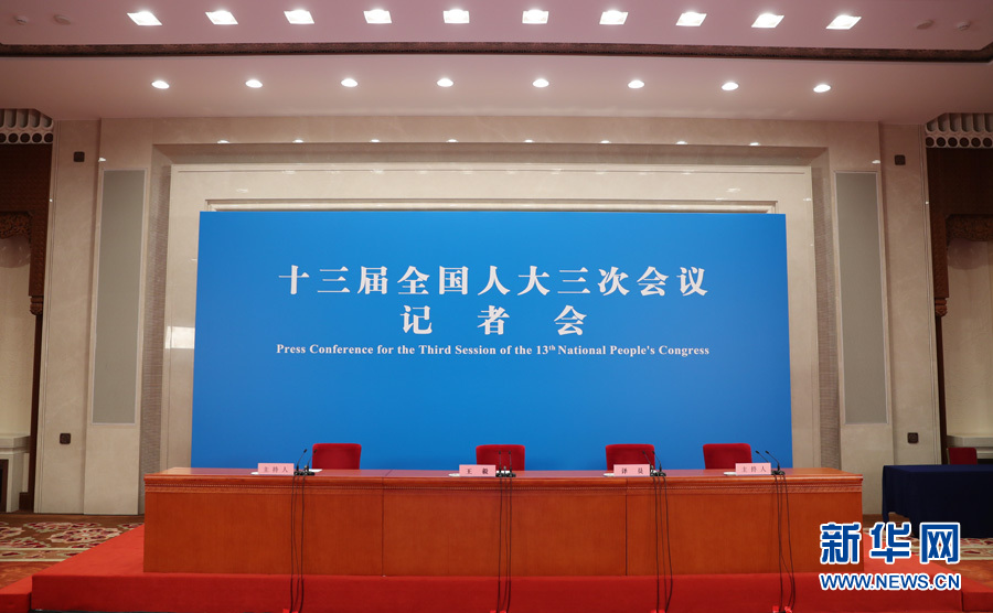 十三屆全國人大三次會議于5月24日(星期日)下午3時在人民大會堂新聞發布廳舉行記者會,邀請國務委員兼外交部長王毅就“中國外交政策和對外關系”相關問題回答中外記者提問。為有效防控疫情,共同維護公共衛生與健康,記者會將采用網絡視頻形式進行。新華網現場直播。圖為記者會現場。新華網 翟子赫 攝