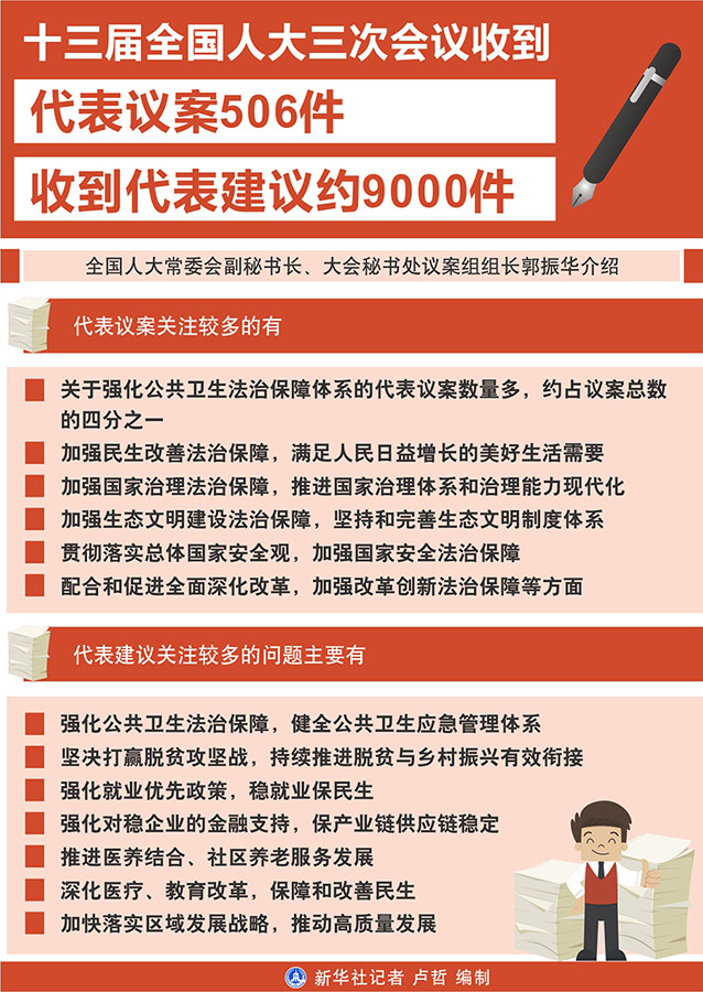 全國人大常委會副秘書長、大會秘書處議案組組長郭振華介紹,今年一個突出特點是關于強化公共衛生法治保障體系的代表議案數量多,約占議案總數的四分之一。圍繞加快構建疫情防控法律體系,提出修改傳染病防治法、刑法、治安管理處罰法,加大對瞞報傳染病、妨礙防疫工作及非法獵殺、銷售、食用野生動物等行為的處罰力度,修改中醫藥法、執業醫師法、獻血法,以及制定公共衛生安全保障等方面的法律。圍繞健全國家公共衛生應急管理體系,提出修改突發事件應對法、價格法、慈善法,制定社會救助法以及戰略物資儲備、行政征用、信息公開、社區應急管理、現場救護等方面的法律。圍繞構建國家生物安全法律法規體系,提出修改野生動物保護法、動物防疫法、食品安全法、漁業法,制定生物安全法等法律。