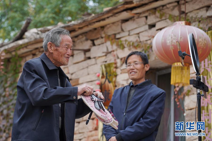 2020年10月28日,河北省沙河市柴關鄉(xiāng)大康村老支書李三平(左)在直播中推介村民手工制作的布鞋。今年年初,李三平在兒子李慶斌直播推介農(nóng)產(chǎn)品的過程中,應網(wǎng)友的要求加入直播,收獲了眾多網(wǎng)友點贊。在他的努力下,大康村的小米、蜂蜜等貨品銷路越來越廣,慕名前來的游客也更多了。