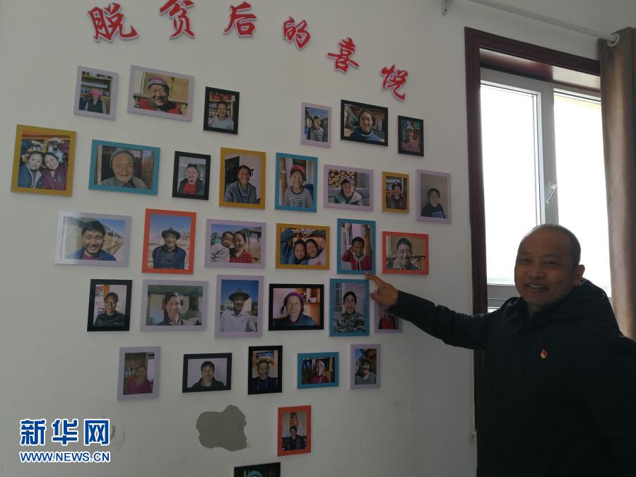 青海省黃南藏族自治州尖扎縣尖扎灘鄉來玉村扶貧第一書記李玉棟向記者介紹來玉村“脫貧后的喜悅”。照片墻集納了村民們脫貧后的笑臉照片(2020年12月11日攝)。新華社記者 顧玲 攝