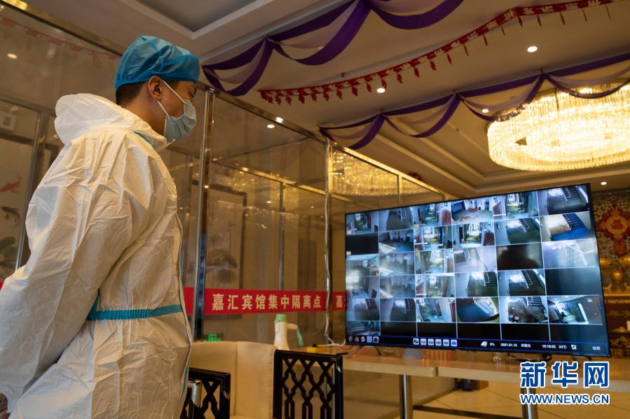 1月15日,工作人員在望奎縣嘉匯酒店內觀看監控。 新華社發(張濤 攝)