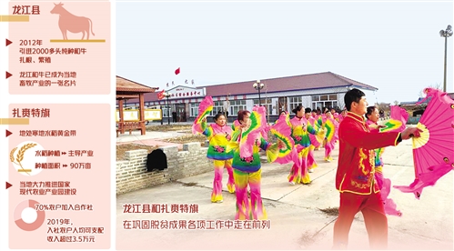 龍江縣是著名的雜糧產區、畜牧大縣。如今,龍江和牛已成為龍江縣畜牧產業的一張名片,帶領群眾走上致富路。“我們研究制定了《高檔肉牛優勢特色產業集群建設方案》,從2016年起出臺了扶持政策。”龍江縣委副書記孫立軍告訴記者,當地引導企業與農戶合作養牛,農戶每購買兩頭母牛,政府會給予一定的補貼款。此外,政府還向企業采購凍精幫助農戶繁育小牛,小牛犢生長到6個月達標后,由企業統一收購,價格在1.2萬元至1.4萬元不等。