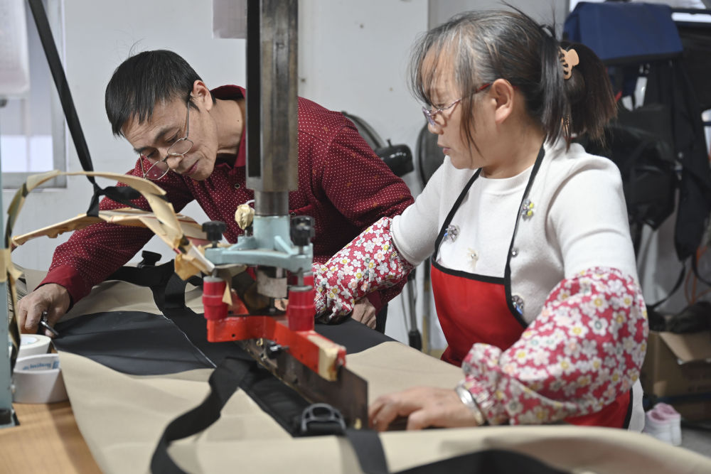 1月25日,張良國和妻子黃遠玲一起加工防水包。