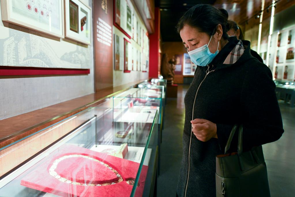 2021年4月3日,在烏魯木齊市革命烈士陵園,瑪依努爾看著愛人艾熱提的獎(jiǎng)?wù)孪萑肷钏肌P氯A社記者 王菲 攝