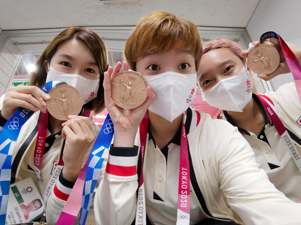 杜凱琹(中)和隊友們與奧運獎牌合影。受訪者供圖
