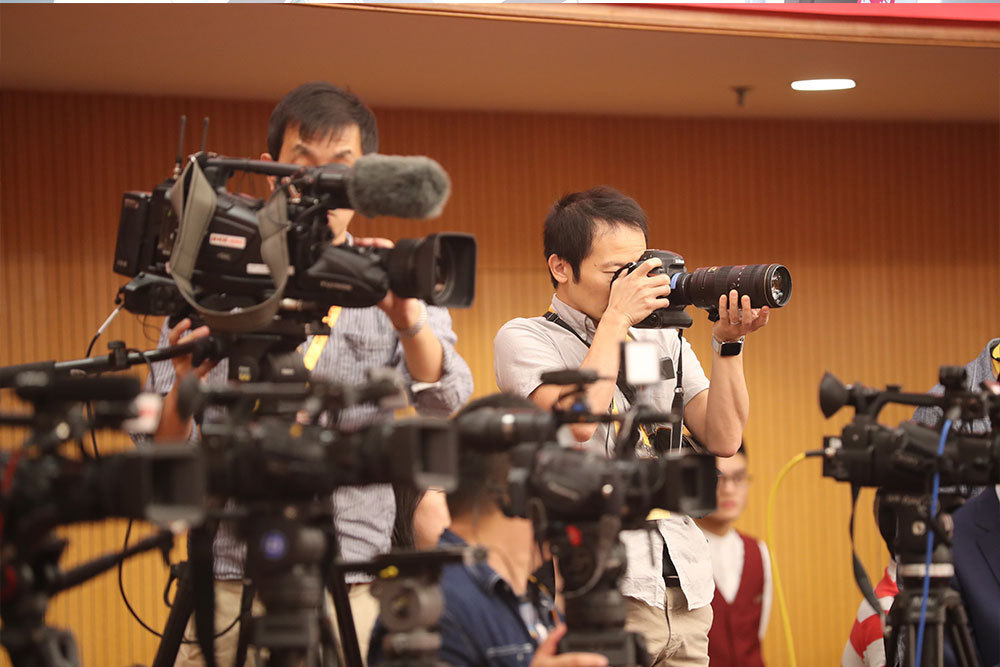 ???? 9月24日,慶祝中華人民共和國成立70周年活動新聞中心在北京梅地亞中心二層新聞發布廳舉辦第一場新聞發布會。圖為新聞發布會現場記者。新華網記者 陳競超 攝