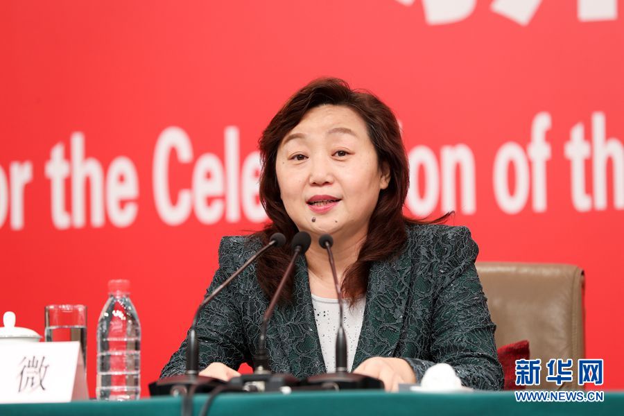 9月25日,慶祝中華人民共和國成立70周年活動新聞中心在北京梅地亞中心二層新聞發布廳舉辦第二場專題集體采訪活動。圖為聯歡活動指揮部聯歡演出部常務副部長龐微介紹相關情況。新華網記者 焦鵬 攝
