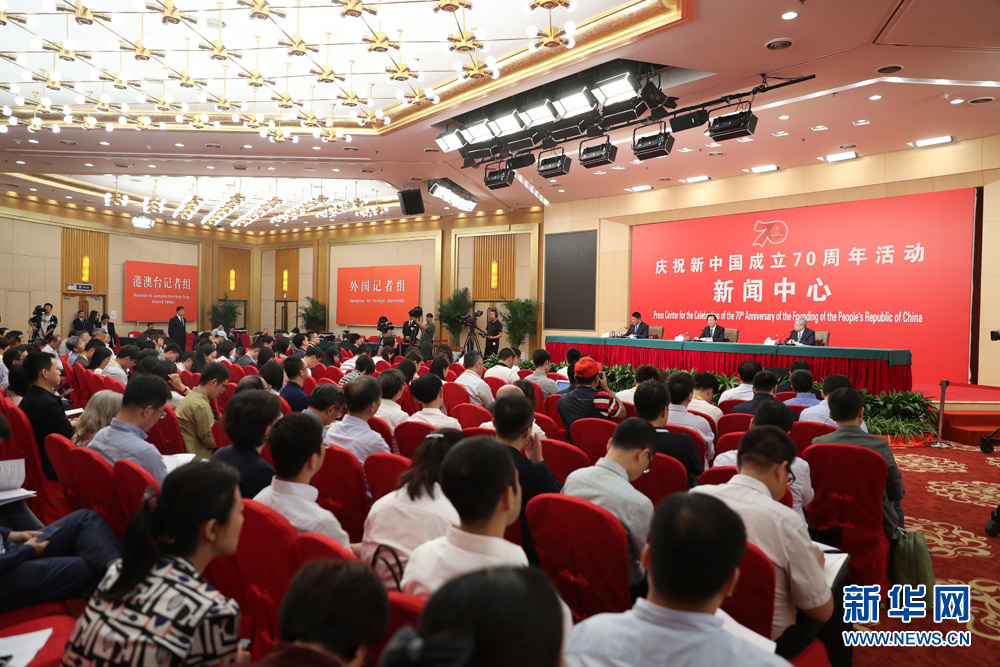 9月27日,慶祝中華人民共和國(guó)成立70周年活動(dòng)新聞中心在梅地亞中心二層新聞發(fā)布廳舉辦第三場(chǎng)新聞發(fā)布會(huì),中央農(nóng)村工作領(lǐng)導(dǎo)小組辦公室主任、農(nóng)業(yè)農(nóng)村部部長(zhǎng)韓長(zhǎng)賦,國(guó)務(wù)院扶貧開發(fā)領(lǐng)導(dǎo)小組辦公室主任劉永富介紹全面建成小康社會(huì),扎實(shí)推進(jìn)脫貧攻堅(jiān)和鄉(xiāng)村振興,并回答記者提問(wèn)。圖為發(fā)布會(huì)現(xiàn)場(chǎng)。新華網(wǎng) 陳杰 攝