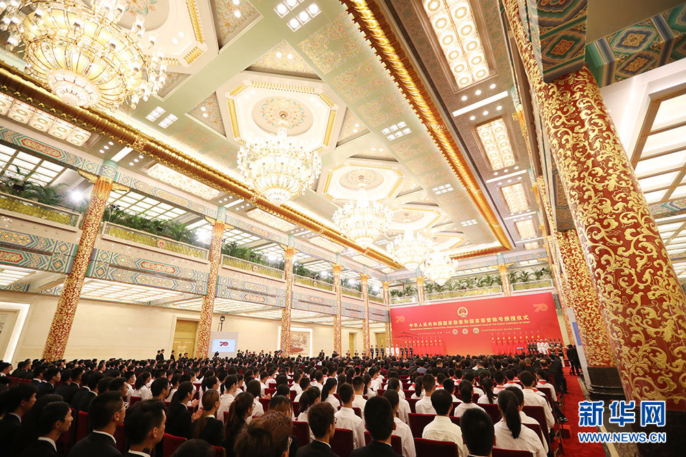 ??? 9月29日上午10時,中華人民共和國國家勛章和國家榮譽稱號頒授儀式在人民大會堂隆重舉行。圖為頒授儀式現場。新華網 陳杰 攝