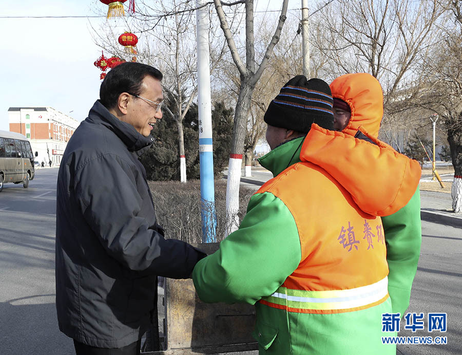 2月12日至13日,中共中央政治局常委、國務院總理李克強在吉林省白城市鎮(zhèn)賚縣考察。 這是2月12日,李克強在鎮(zhèn)賚縣同環(huán)衛(wèi)工人握手交流。新華社記者 龐興雷 攝