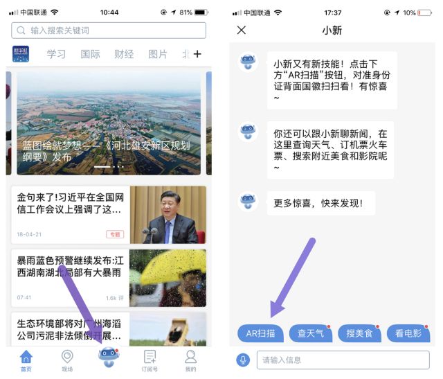 ↑進入新華社客戶端首頁,點擊“小新機器人”后,選擇AR掃描功能(AR掃描功能不會保留任何用戶信息)。將新華社客戶端升級到最新版本可以獲得更好的體驗。