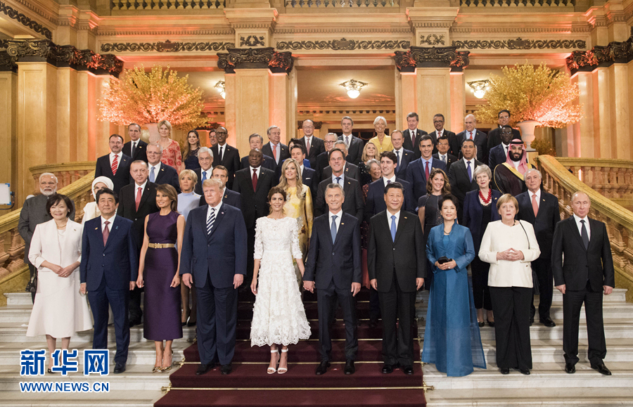 當地時間11月30日,二十國集團領導人第十三次峰會在阿根廷布宜諾斯艾利斯舉行。當晚,國家主席習近平和夫人彭麗媛同出席峰會的各代表團團長夫婦集體合影。新華社記者 李學仁 攝