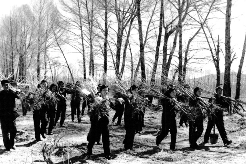 20世紀(jì)六七十年代,右玉縣群眾在荒山植樹(翻拍照片)。新華社發(fā)