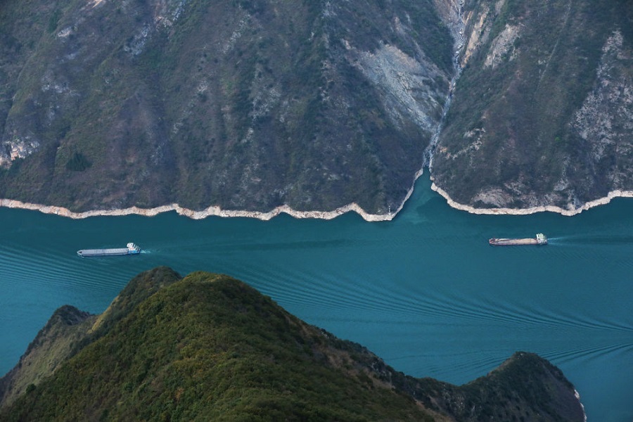 貨輪行駛在重慶巫山縣境內的長江巫峽段江面上。