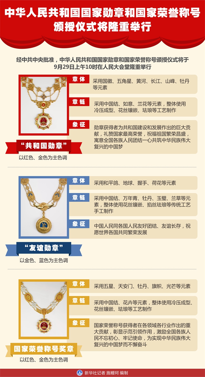 經中共中央批準,中華人民共和國國家勛章和國家榮譽稱號頒授儀式將于9月29日上午10時在北京人民大會堂隆重舉行。 這是“共和國勛章”。 新華社發