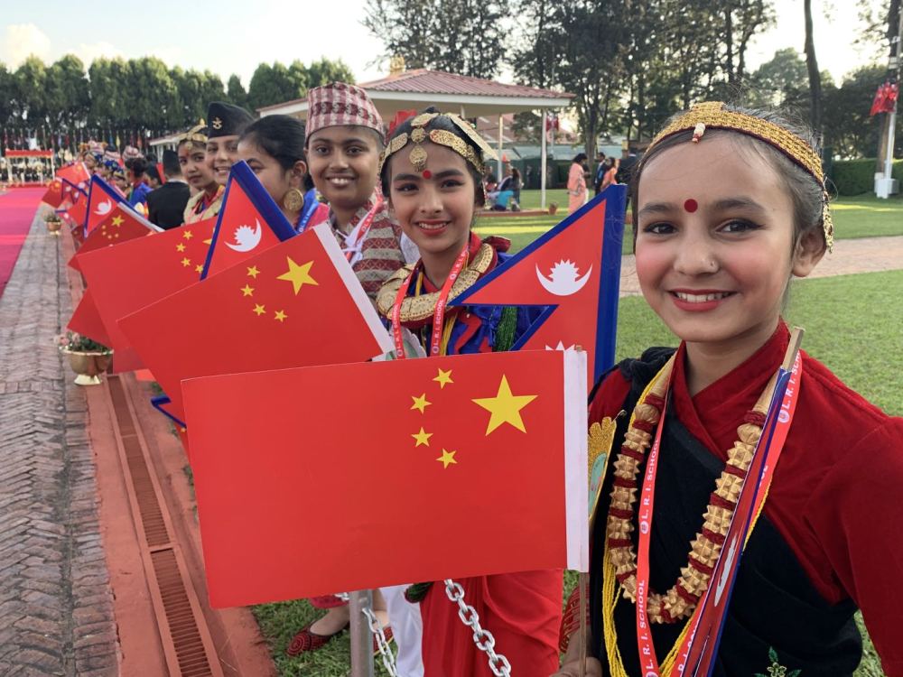 2019年10月12日,尼泊爾首都加德滿都特里布萬國際機場,尼泊爾孩子們站在紅地毯一側,熱烈歡迎中國國家主席習近平來訪。新華社記者高潔攝