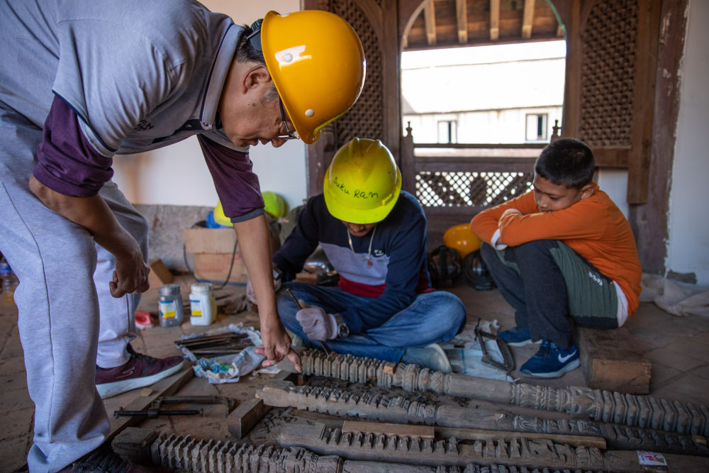 2019年10月10日,在尼泊爾加德滿都杜巴廣場,中國文物修復師周建國(左)在九層神廟修復現場指導尼泊爾工人。新華社記者張可任攝