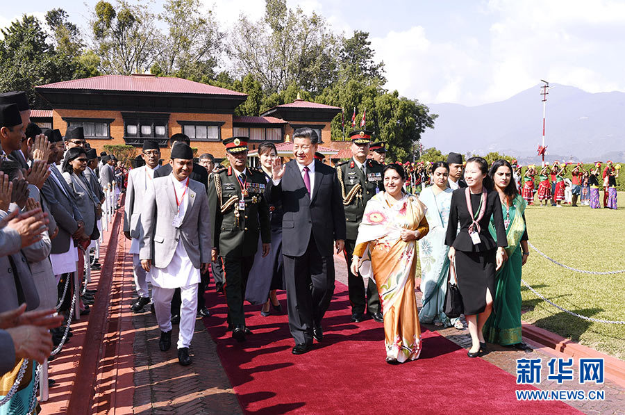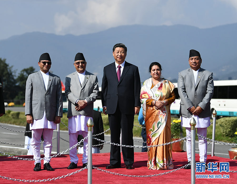 班達(dá)里在機(jī)場為習(xí)近平舉行隆重歡送儀式。尼泊爾副總統(tǒng)普恩、總理奧利、聯(lián)邦議會聯(lián)邦院主席蒂米爾西納、所有內(nèi)閣成員、軍方高級將領(lǐng)參加。