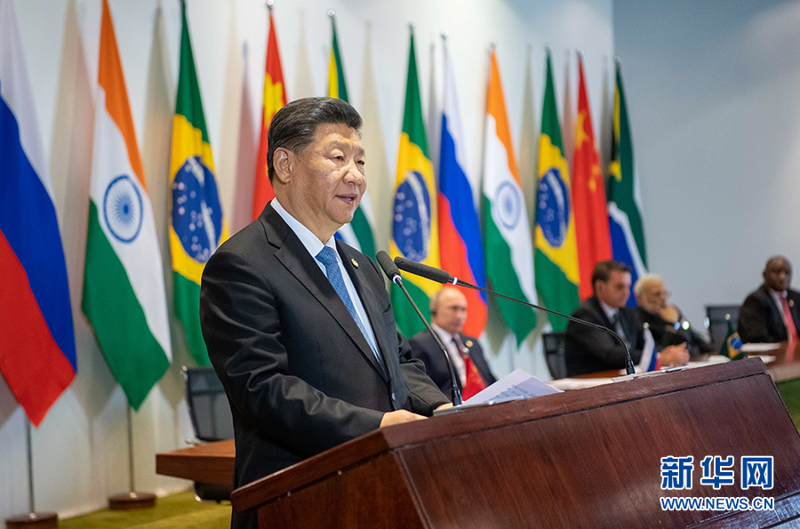 當地時間11月14日,金磚國家領導人同金磚國家工商理事會和新開發銀行對話會在巴西利亞舉行。中國國家主席習近平、巴西總統博索納羅、俄羅斯總統普京、印度總理莫迪、南非總統拉馬福薩共同出席。這是習近平發表講話。 新華社記者 王曄 攝