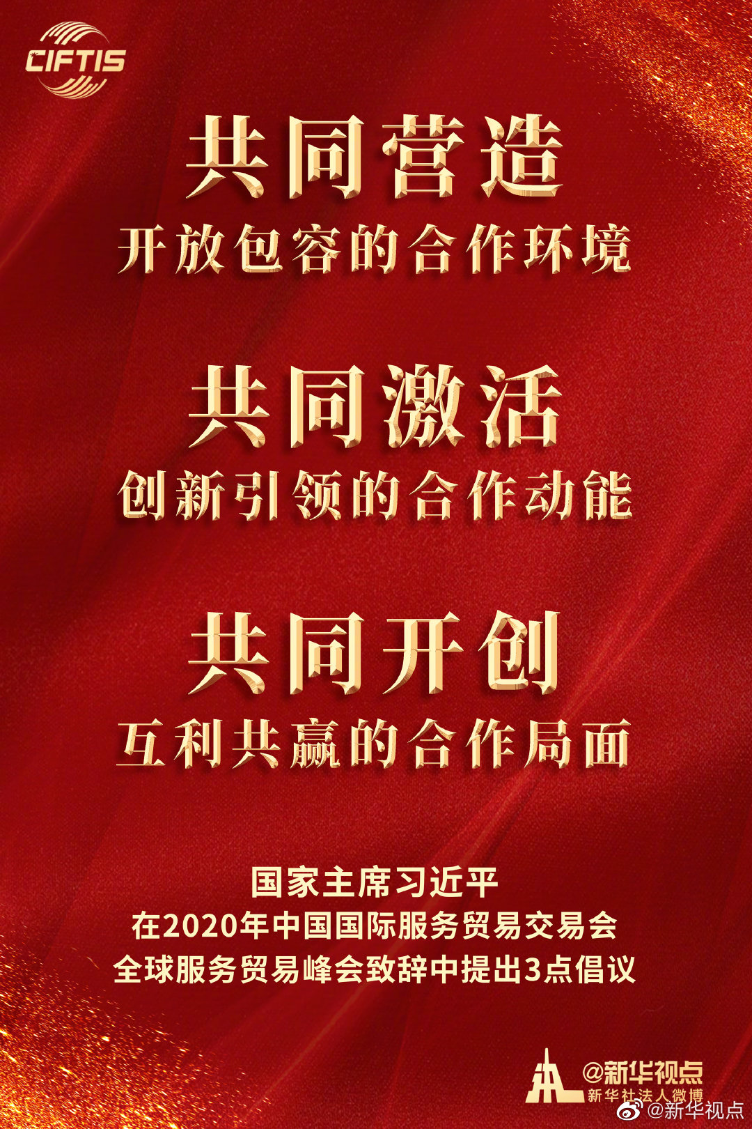 國家主席習近平在2020年中國國際服務貿易交易會全球服務貿易峰會上發表視頻致辭時就服務業開放合作提出3點倡議:共同營造開放包容的合作環境;共同激活創新引領的合作動能;共同開創互利共贏的合作局面。