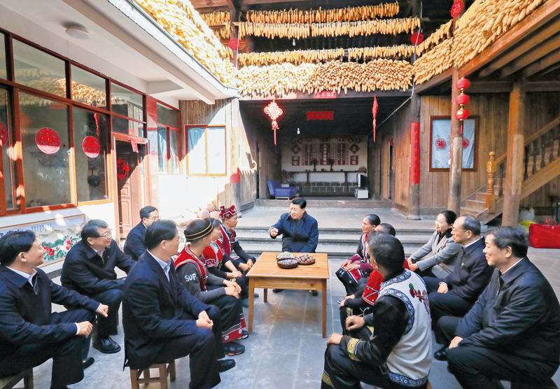 2020年1月19日至21日,中共中央總書記、國家主席、中央軍委主席習(xí)近平來到云南,看望慰問各族干部群眾,向全國人民致以新春祝福。這是19日下午,習(xí)近平在騰沖市清水鄉(xiāng)三家村中寨司莫拉佤族村,同村民李發(fā)順一家聊家常,詳細詢問脫貧情況。 新華社記者 鞠鵬/攝