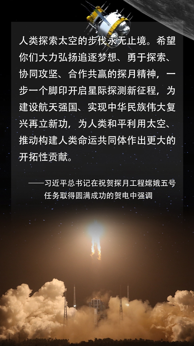 偉大精神燭照奮進征程。探索浩瀚宇宙,是中華民族不懈追求的偉大夢想。嫦娥五號任務的圓滿成功,以及在探月實踐中形成的寶貴精神財富,激蕩起我們科技自立自強的信心與力量,激勵著中國航天人繼續勇攀高峰。追夢沒有坦途,圓夢唯有實干。我們要牢記總書記重要囑托,大力弘揚探月精神,開啟星際探測新征程,向更加璀璨的星空邁出更堅定的中國步伐,為建設航天強國、實現中華民族偉大復興的中國夢,為人類和平利用太空、推動構建人類命運共同體作出更大的貢獻。
