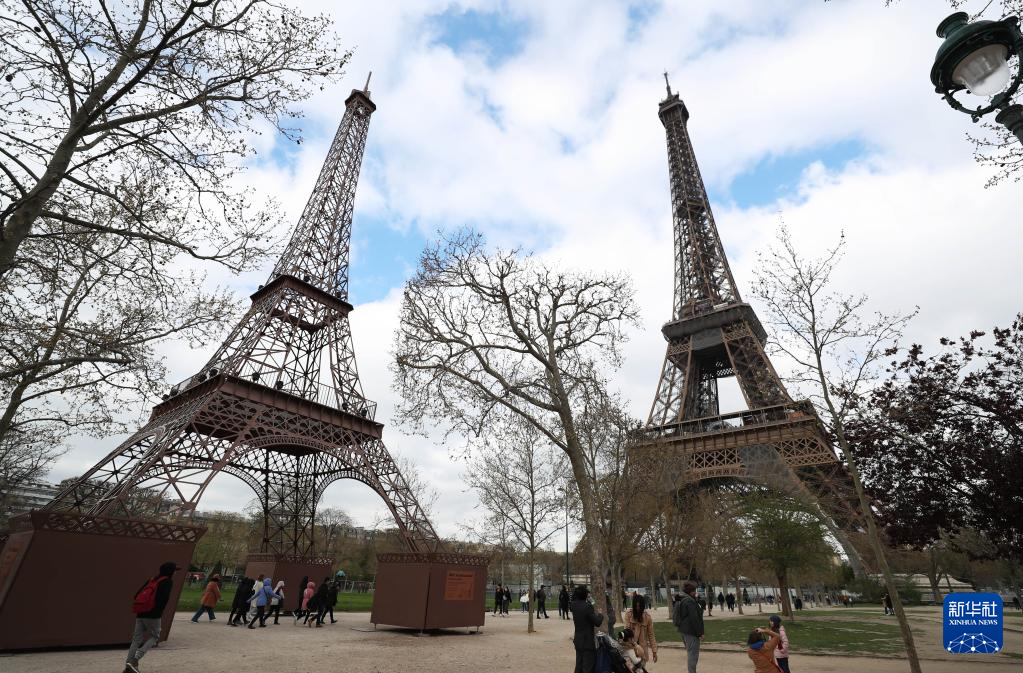 这是4月3日在法国巴黎拍摄的埃菲尔铁塔(右)和“小埃菲尔铁塔”。
