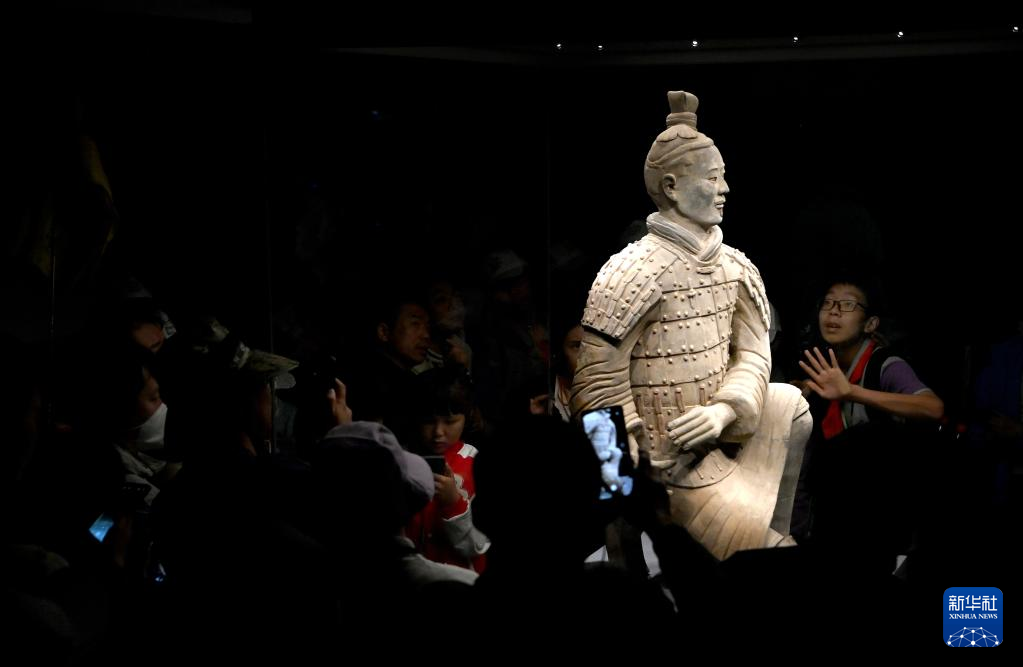 游客在秦兵马俑二号坑遗址参观跪射俑(4月26日摄)。