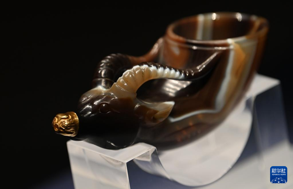 5月11日,游客在陕西历史博物馆参观镶金兽首玛瑙杯。镶金兽首玛瑙杯的造型,与起源于古希腊的酒具“来通”相似,“来通”曾广泛流行于中亚、西亚地区,沿着丝绸之路不断东传进入中国。