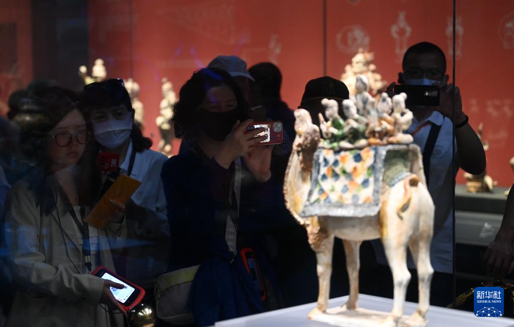 5月11日,游客在陕西历史博物馆参观唐三彩骆驼载乐俑。这件唐三彩骆驼载乐俑既是唐代文化艺术、制作工艺发达昌盛的重要物证,也见证了丝绸之路上艺术的交流与融合。