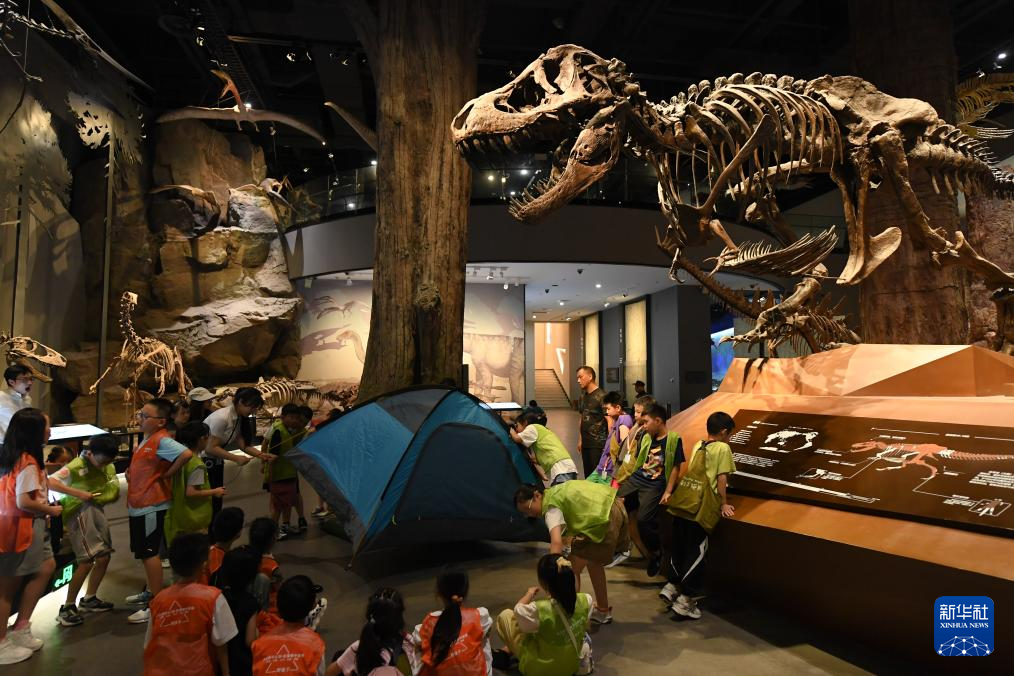 7月26日,参加夜游的孩子们在博物馆内了解恐龙。