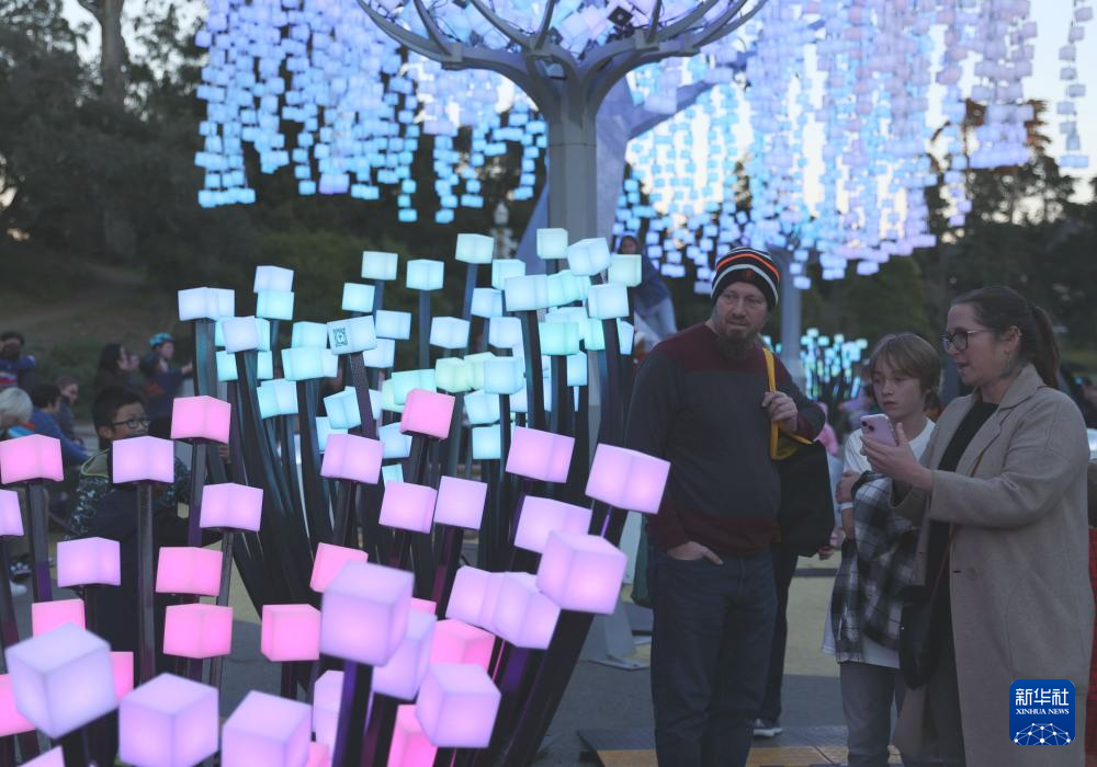12月23日,人们在美国旧金山的金门公园观赏灯饰。