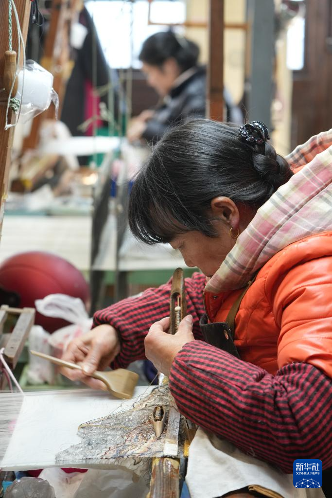2月19日,缂丝师傅在位于德清乾元镇的“缂金堂”内制作水波纹产品。