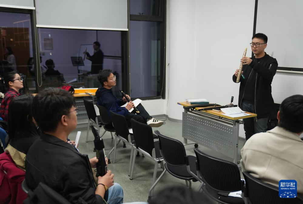 4月7日晚,在上海市群众艺术馆,电吹管课程的老师在授课。
