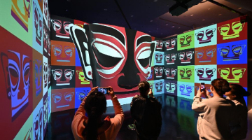 4月23日,参加论坛的嘉宾使用AR(增强现实)眼镜参观良渚博物院展品。